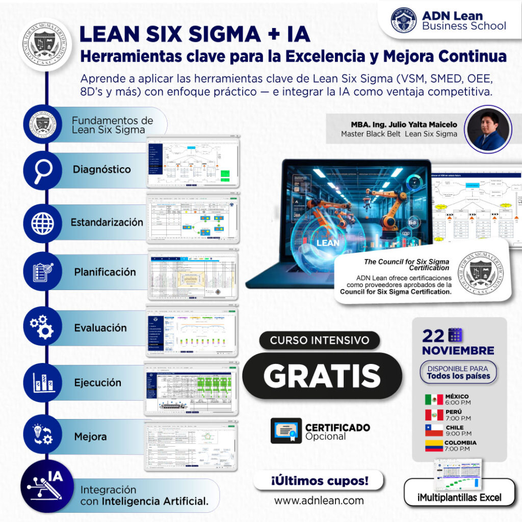 Este curso gratuito intensivo en vivo te mostrará cómo aplicar Lean Six Sigma de manera práctica y profesional, conocerás plantillas reales desarrolladas para consultorías de alto nivel.