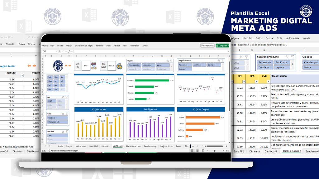 Optimiza tus campañas publicitarias en Facebook e Instagram con nuestra plantilla especializada para Meta Ads. Diseñada para gestionar, planificar y analizar el rendimiento de tus anuncios, esta herramienta te ayudará a tomar decisiones basadas en datos reales.