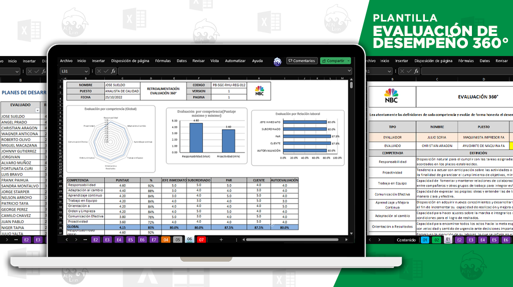 La plantilla editable esta diseñada para recopilar información sobre el rendimiento de un individuo desde múltiples perspectivas.