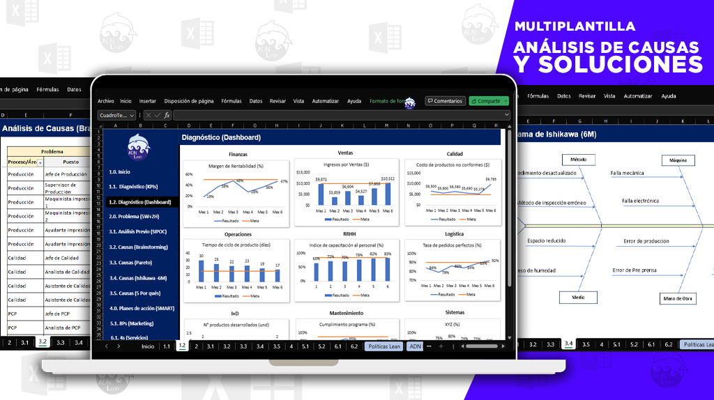 La plantilla Excel “Análisis de Causas y Soluciones” proporciona un conjunto de herramientas para identificar y resolver problemas de manera estructurada. (5W 2H, 6M, ISHIKAWA, PARETO, SMART, 8P, 4S)